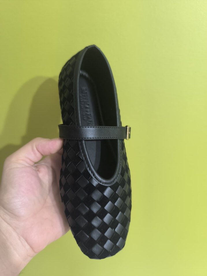 Siyah renkte, tokalı bantlı ve blok topuklu kadın babet. Örgü desenli kauçuk malzemeden, günlük sokak stiline uygun minimal tasarım.