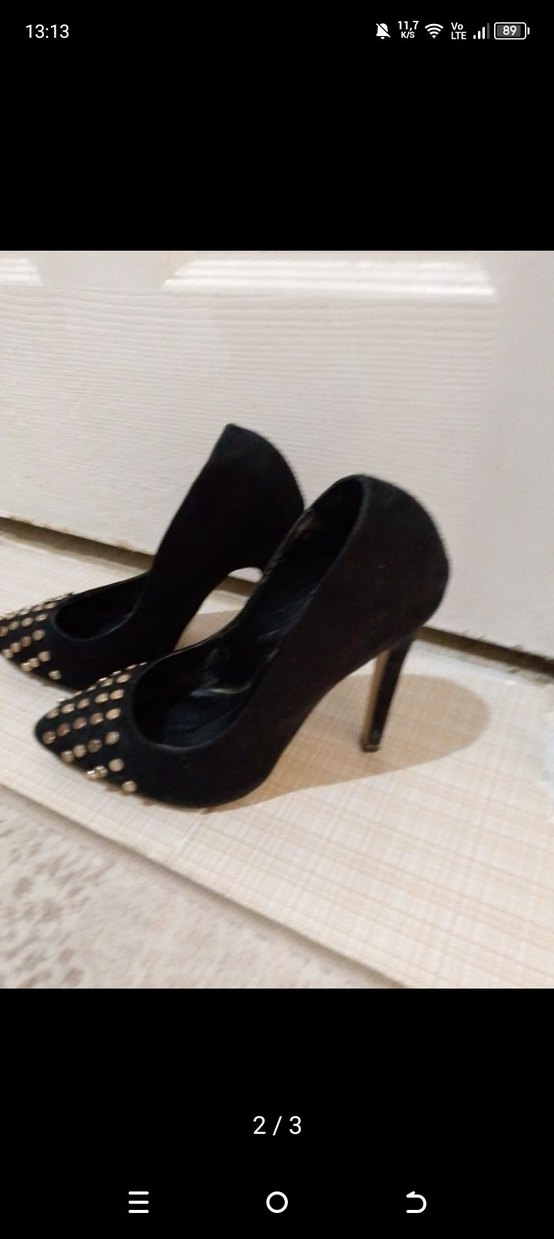 Desenli burun ve tokalı detaylara sahip siyah topuklu ayakkabı. Lastik malzemeden, cesur gotik tarzda, romantik geceye uygun.
