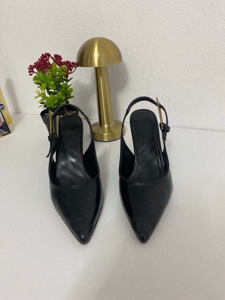 Siyah tokalı stiletto topuklu ayakkabı, hafif çiçek desenli. Kauçuk malzemeden üretilmiş, ofis için minimalist ve çağdaş tarzda uygun.