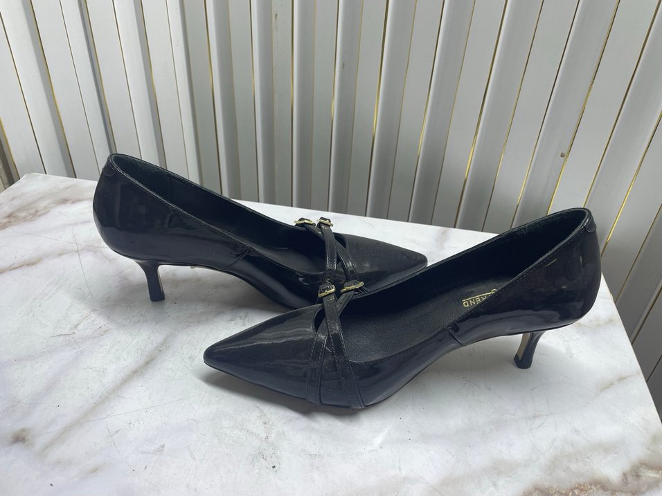 Siyah, tokalı bantlara sahip, sivri burunlu stiletto ayakkabılar. Ofis kullanımı için modern klasik tarzda, kauçuk malzemeden yapılmıştır.
