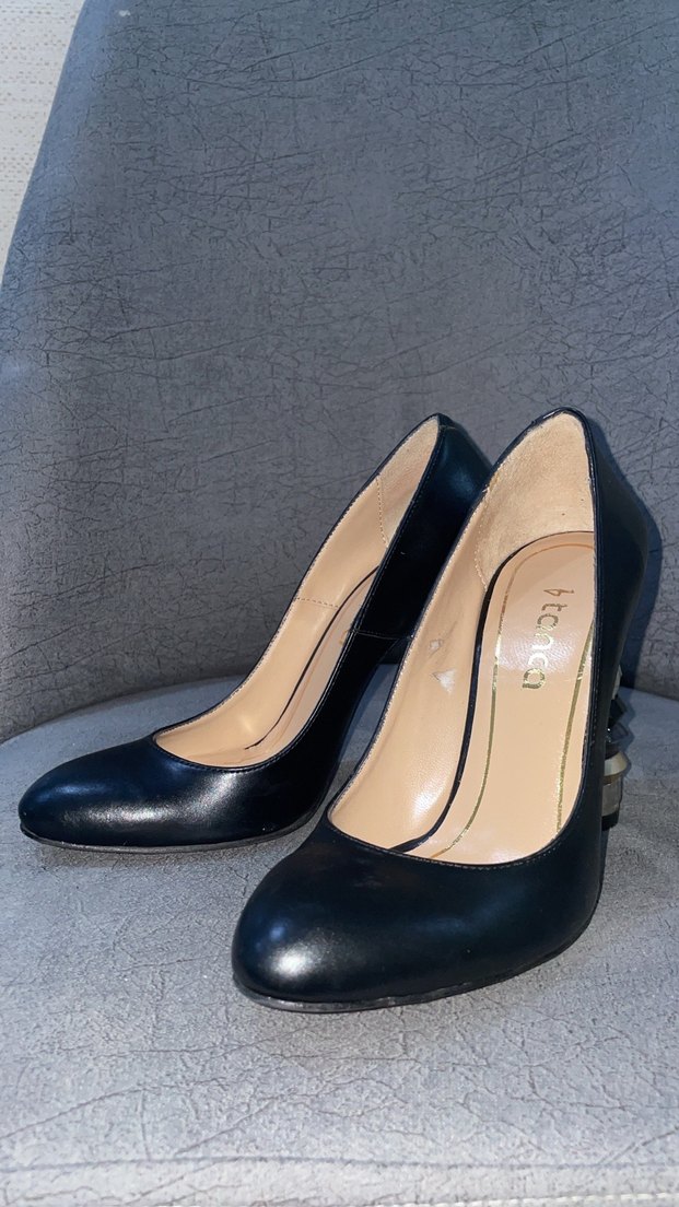 Siyah tokalı stiletto topuklu kadın ayakkabısı, kauçuk malzemeden üretilmiş, modern klasik tarzda ofis kullanımı için uygundur.