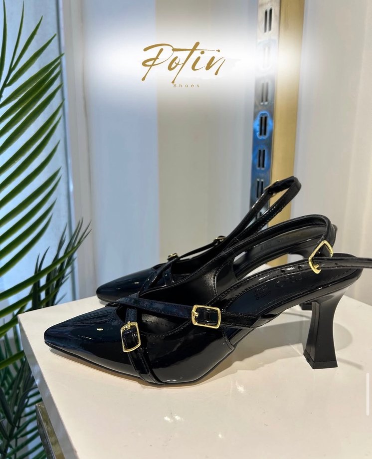 Siyah tokalı stiletto topuklu ayakkabılar, modern klasik tarzda ve hafif yılan derisi desenli. Ofis kullanımı için Paris havası taşıyor.