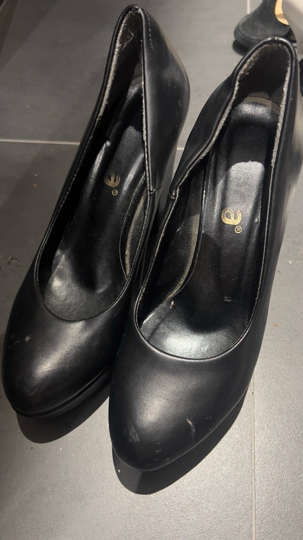 Siyah kauçuk malzemeden yapılmış, tokalı kadın stiletto ayakkabılar. Ofis kullanımı için uygun, cesur gotik tarzda ve desensiz tasarıma sahip.