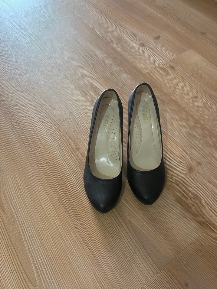 Siyah parlak yüzeyli, tokalı stiletto topuklu ayakkabı. Ofis için klasik ve minimalist tarzda, kauçuk malzemeden üretilmiştir. Ürün görselde görüldüğü gibidir.