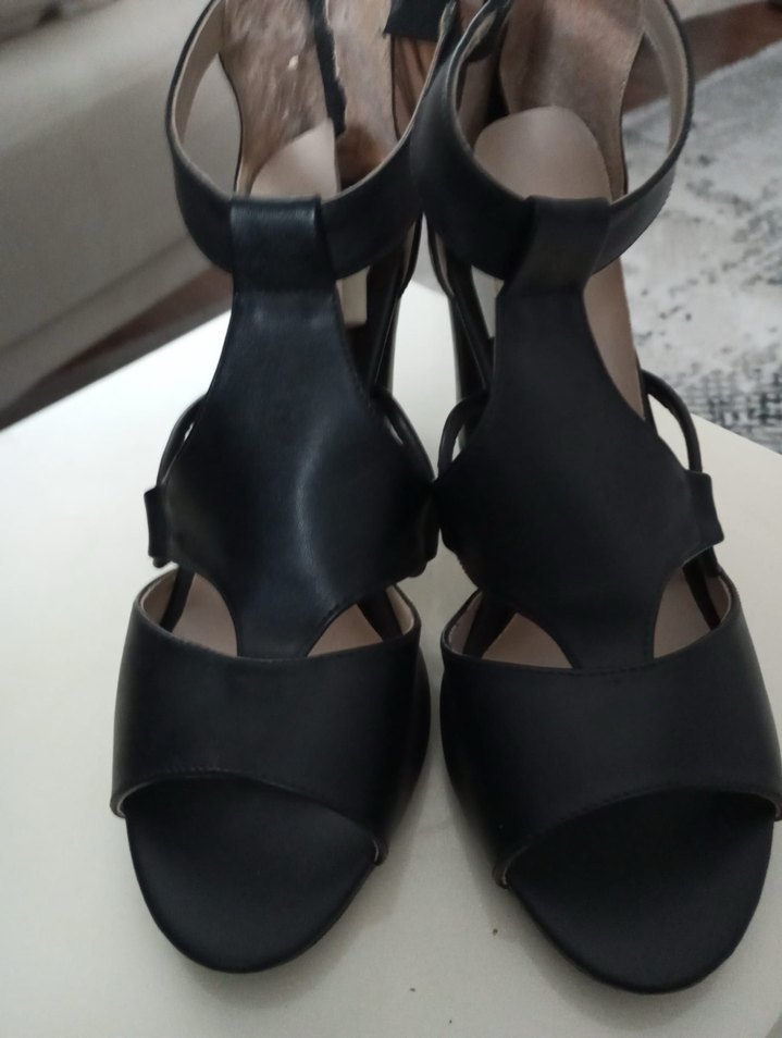 Siyah tokalı, lastik malzemeden yapılmış stiletto topuklu ayakkabılar. Minimalist gotik tarzıyla romantik akşamlar için uygun.