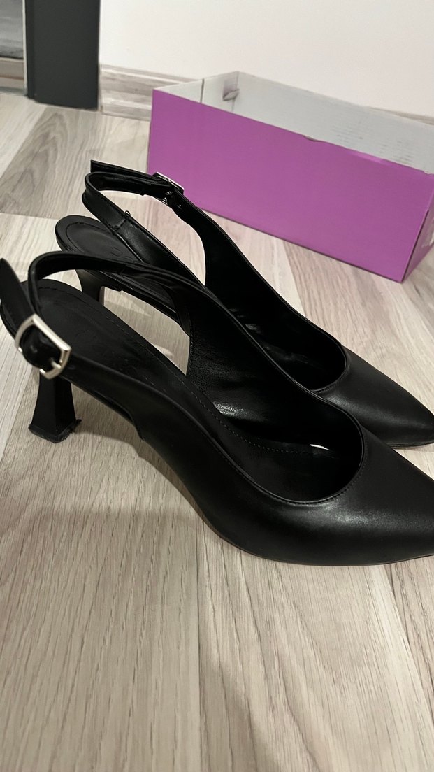 39 numara bi kez giyildi. Tertemiz Siyah tokalı, kauçuk malzemeden yapılmış stiletto topuklu ayakkabılar. Desensiz, gotik tarzda ve klasik zarafeti yansıtan ofis için uygun model.