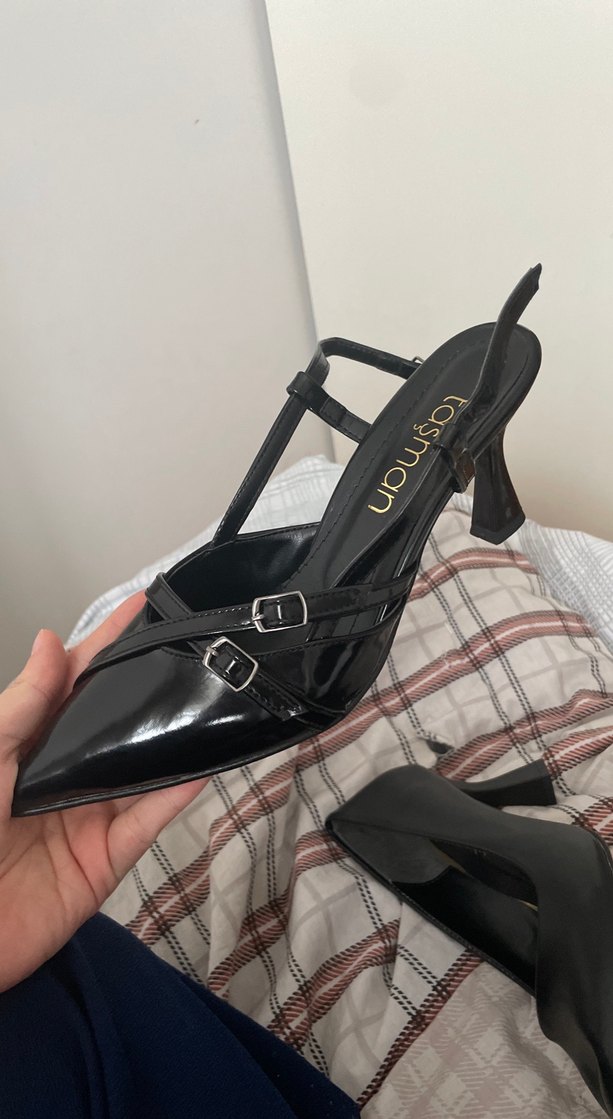 Siyah tokalı bantlara ve sivri buruna sahip stiletto topuklu ayakkabı, cesur gotik tarzı ve baskılı kauçuk malzemesiyle dikkat çeker. Günlük kullanım için Paris etkili.