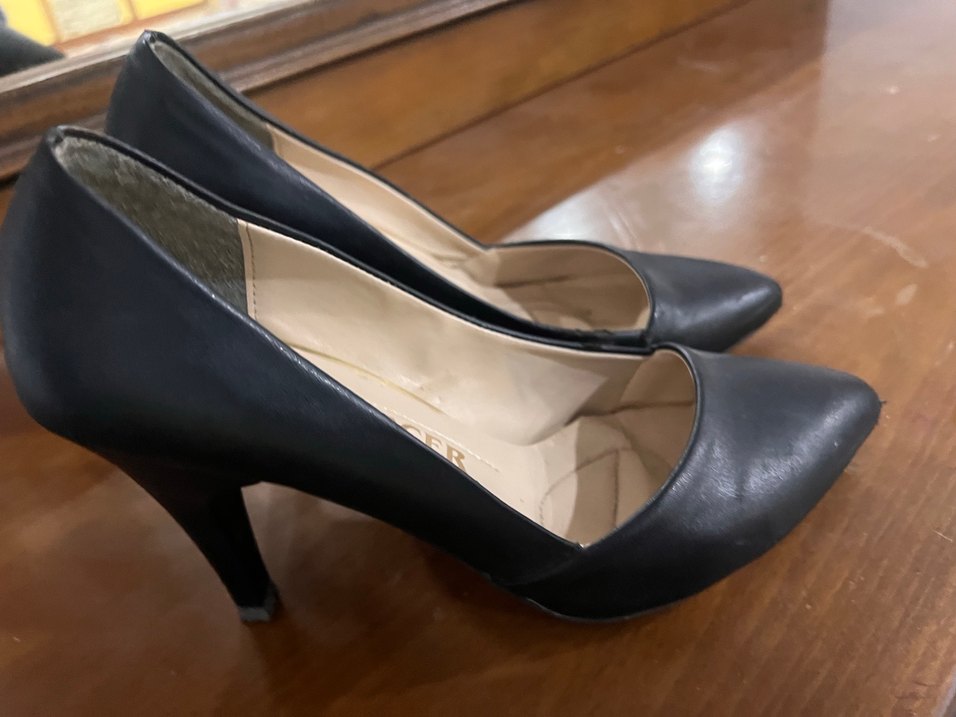 Siyah tokalı, kauçuk malzemeden yapılmış stiletto topuklu ayakkabılar. Modern klasik tarzda, ofis için uygun ve Paris zarafetini yansıtıyor.