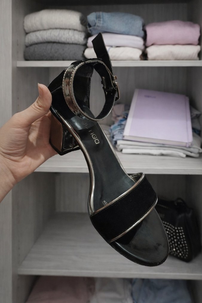 Siyah , tokalı ve kalın topuklu kadın ayakkabısı.