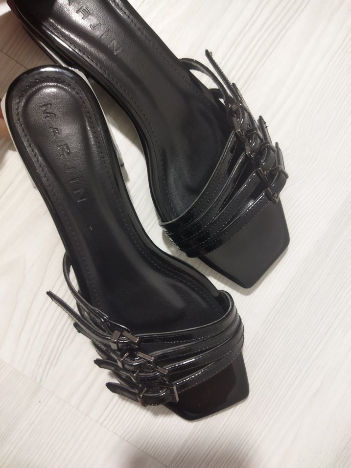 Siyah , tokalı bantlı ve kalın topuklu kadın ayakkabısı. Kauçuk malzemeden, gotik ve Paris tarzı birleşimi. hiç giyilmedi herhangi bir sorunu yoktur kısa topuklu ve çok şık