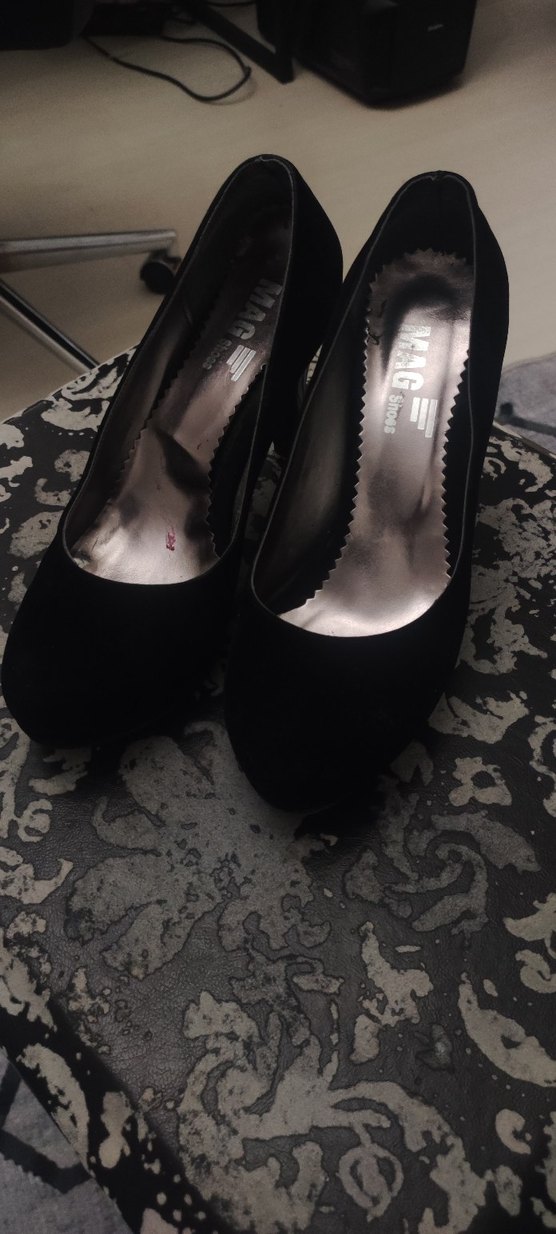 Siyah, tokalı yüksek topuklu stiletto. Kauçuk malzemeden yapılmış, koyu renkli gotik tarzda, desen içermeyen ayakkabı. Romantik geceler için uygundur.