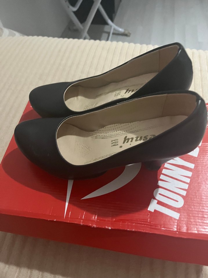 Siyah renkte, tokalı detaylı, lastik malzemeden yapılmış yüksek topuklu stilettolar. Cesur iş tarzları ve ofis kullanımı için uygundur.