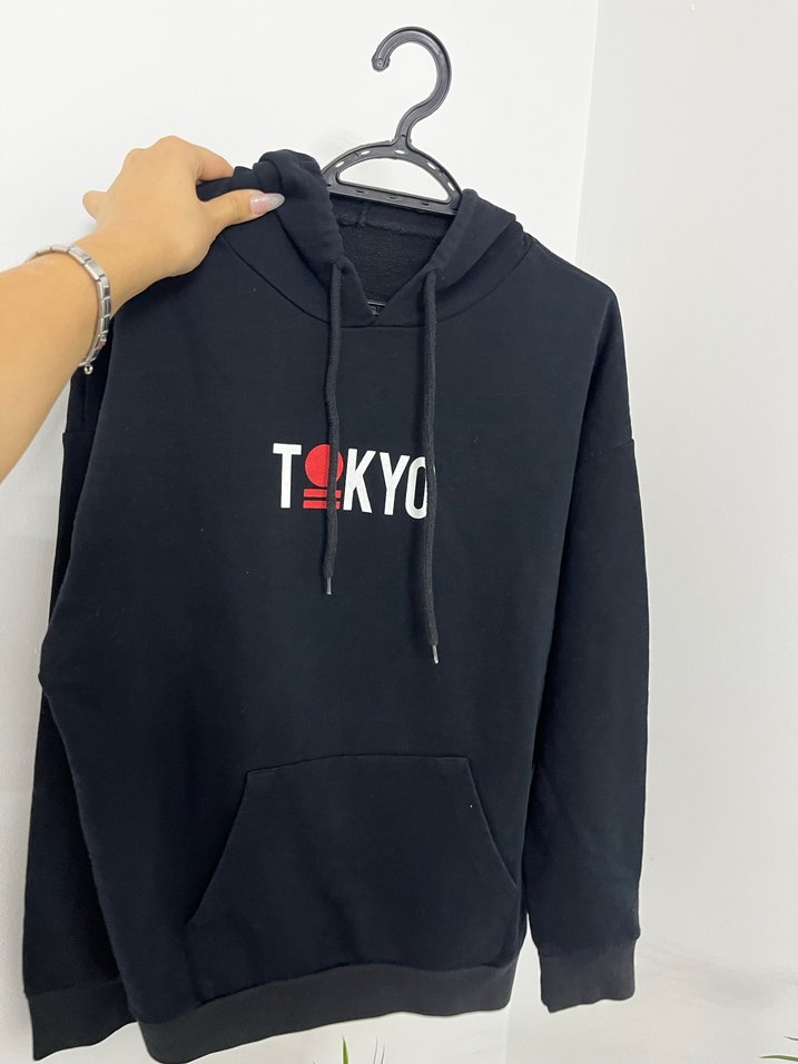 Siyah renkte, uzun kollu, kapüşonlu ve bol kesim kadın sweatshirt. Önünde "TOKYO" baskısı ve fermuarlı detay bulunur. Sentetik kumaştan üretilmiştir.