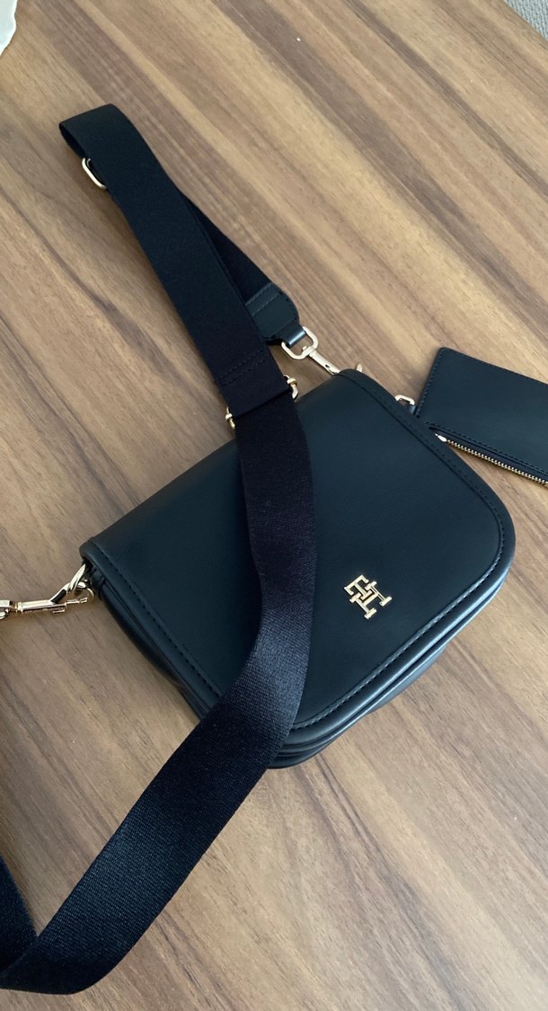 Tommy Hilfiger Kemer tokalı siyah deri omuz çantası, günlük kullanım için uygun, klasik şıklıkla sade tasarım sunar.