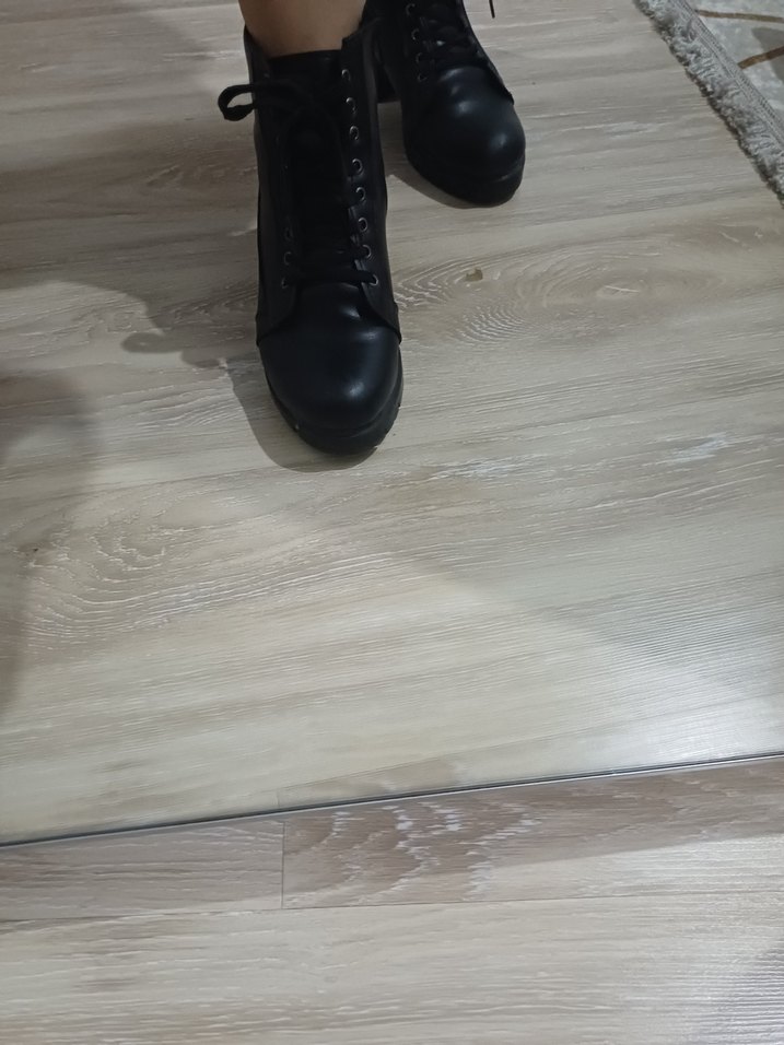 Siyah, tokalı, lastik malzemeden yapılmış topuklu gotik kadın botları. Günlük kullanıma uygun, trend ve rahat tarzda.