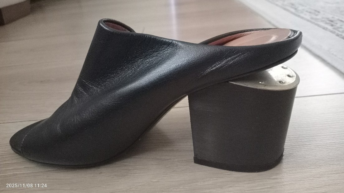 Siyah kadın sabo ayakkabılar blok topuklu ve tokalıdır, dayanıklı kauçuk malzemeden ve hakiki deriden yapılmıştır. Çağdaş ve minimalist tasarımı ofis için uygundur. İnce ayaklara uygun, taraklı için uygun değil
