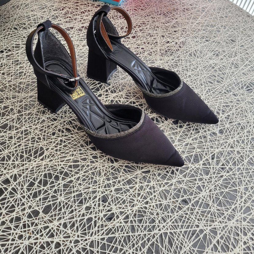 blok topuklu kadın ayakkabısı. Bağcıklı bilek kayışı ve ofis için uygun şık koyu renk tasarıma sahiptir. Tabanı kauçuktur.