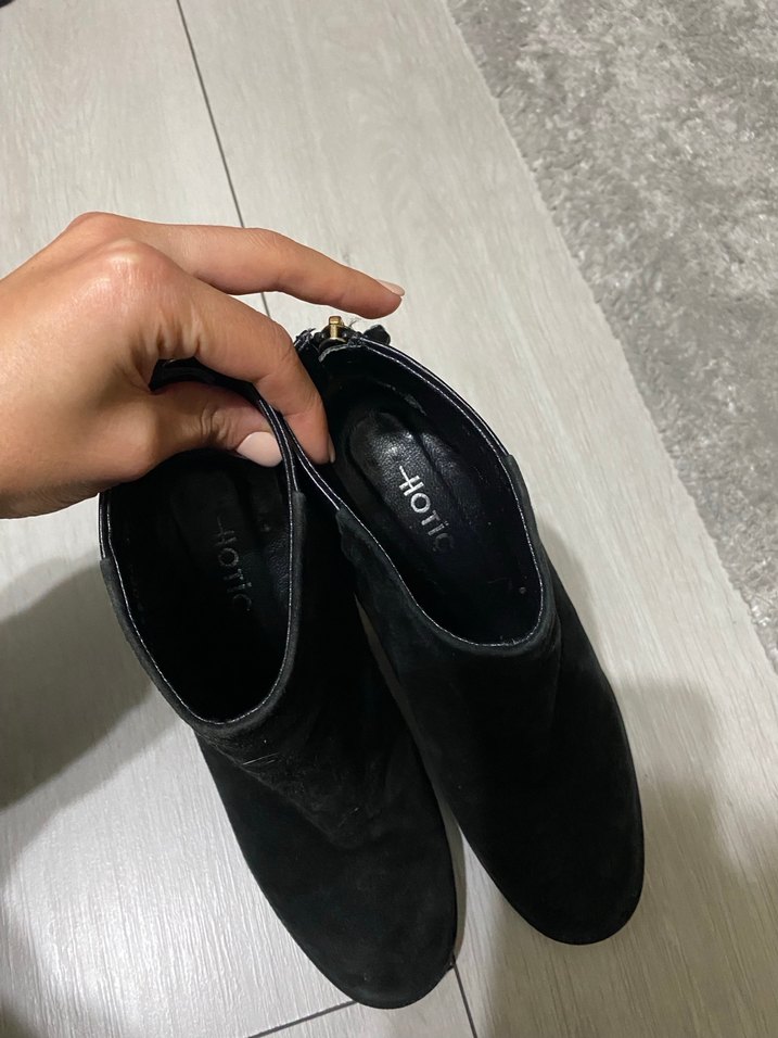Siyah deri ve süet malzemeden yapılmış,topuklu ve fermuarlı kadın botu topuk kısmı gold detaylıdır. Minimalist gotik tarzda, günlük ve ofis kullanım için uygun. Çok az kullanılmıştır, hiçbir kusuru yoktur