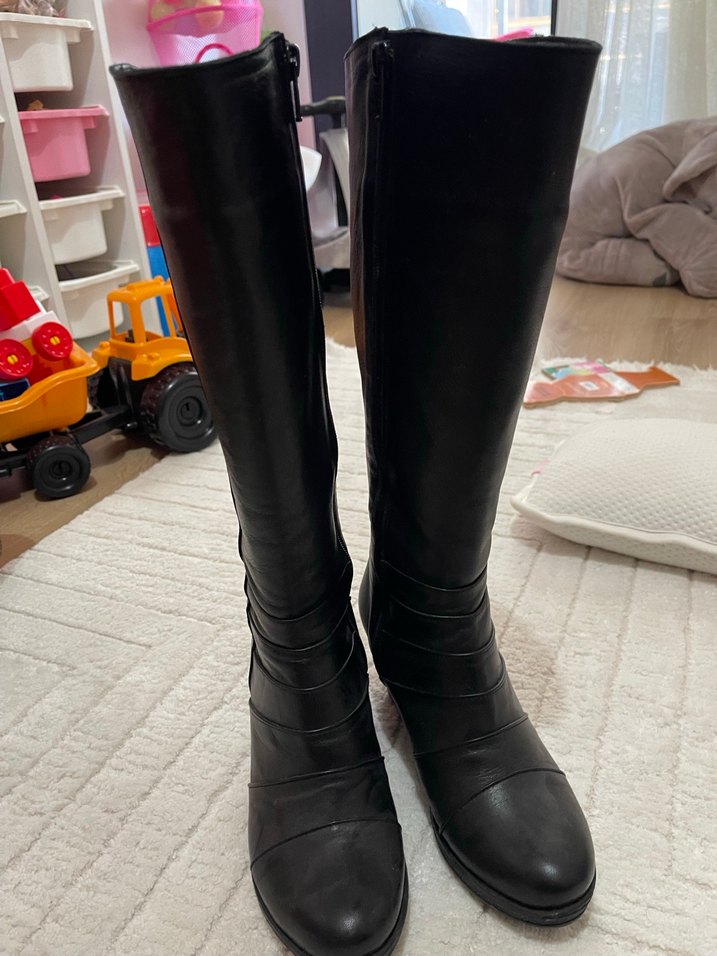 Siyah, lastik malzemeden dizüstü botlar. Stiletto topuklu, tokalı detaylara sahip, gotik stile uygun günlük kullanıma uygun.
