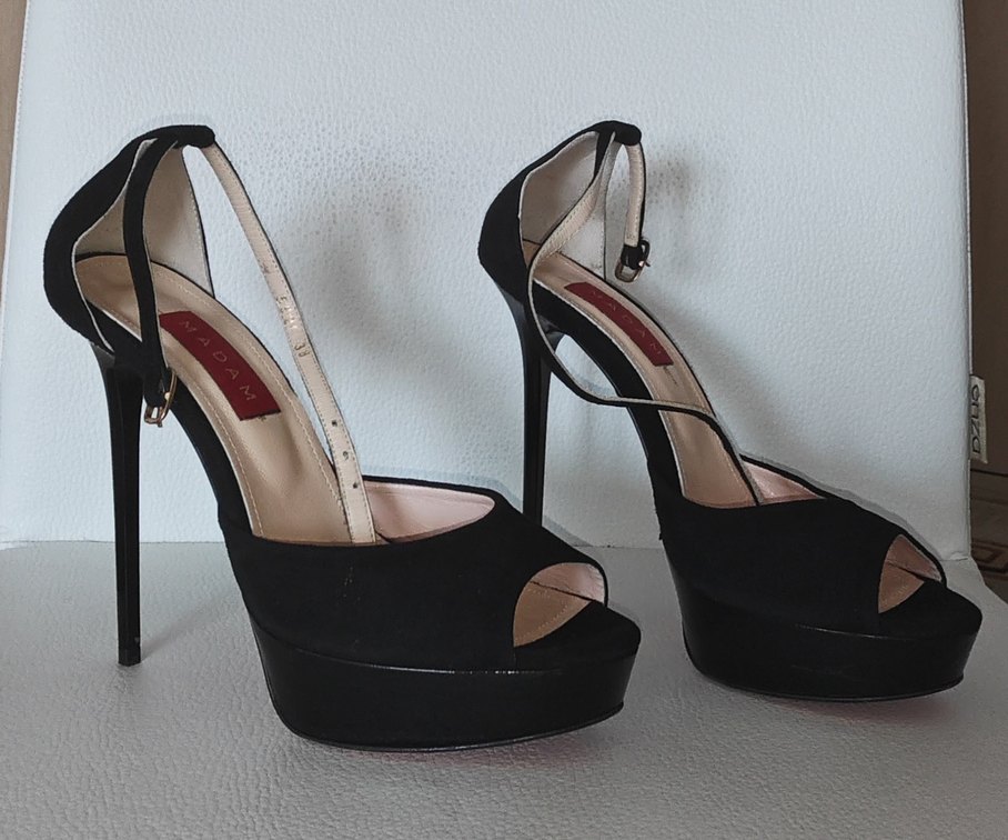 Kemerli siyah topuklu ayakkabılar, kauçuk malzemeden üretilmiştir. Gotik tarzıyla romantik gece için uygundur.