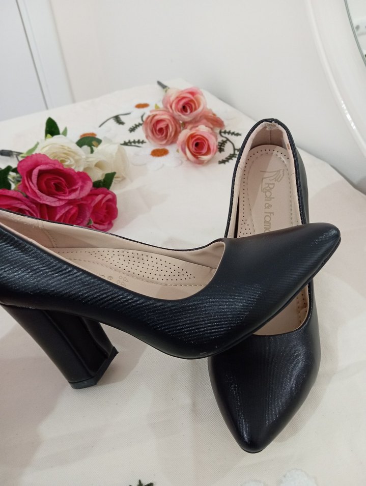 Siyah topuklu kadın stiletto, blok topuklu ve hafif yılan derisi desenli. Kauçuk malzemeden, modern klasik ve ofis şıklığı sunar.