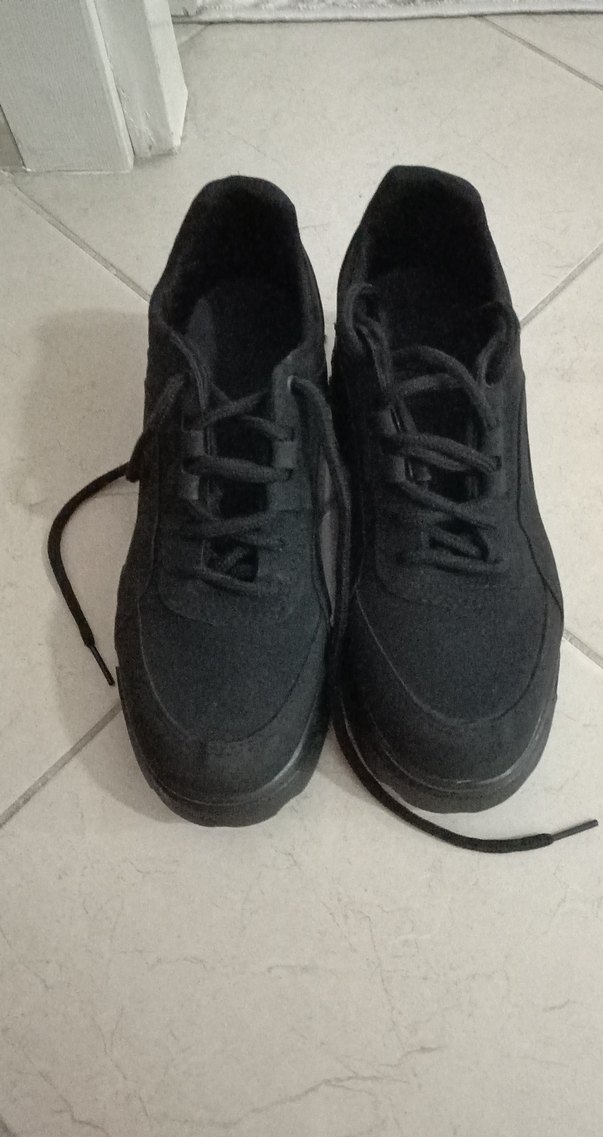 Siyah renkte, kauçuk malzemeden yapılmış, topuklu kadın spor ayakkabısı. Trendy casual ve street wear tarzına uygun, spor için ideal ve zahmetsiz şıklık sunar. giyilmedi