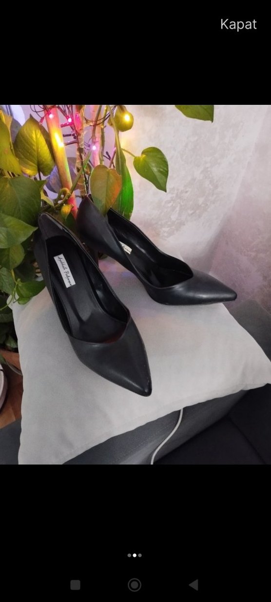 Siyah, sivri burunlu ve tokalı kadın stiletto ayakkabılar. Dayanıklı kauçuk malzemeden, çiçek desenli ve ofis için uygun.