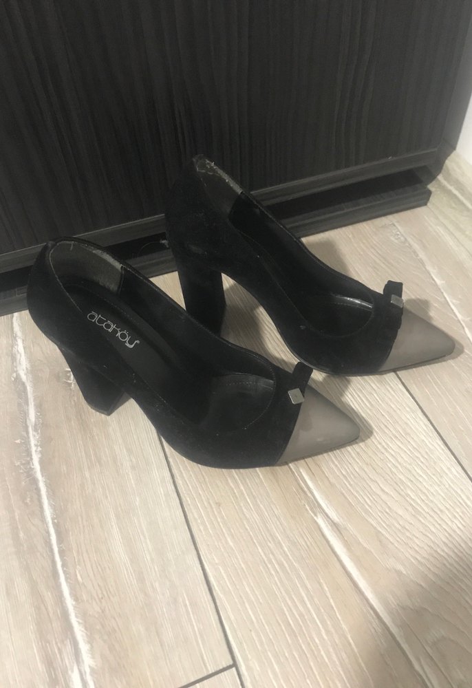 Siyah, tok topuklu ve tokalı kadın stiletto. Lastik malzemeden yapılmış, ofis kullanımı için uygun cesur gotik tarzda bir ayakkabı.