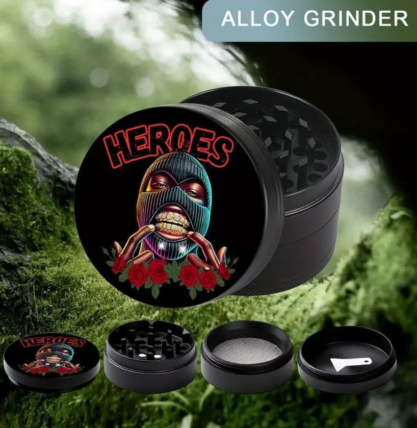 Kapağında 'Heroes' grafik tasarımlı siyah toz öğütücü. Toz öğütme ve saklama için çoklu bölümleri bulunur. ⚙️
