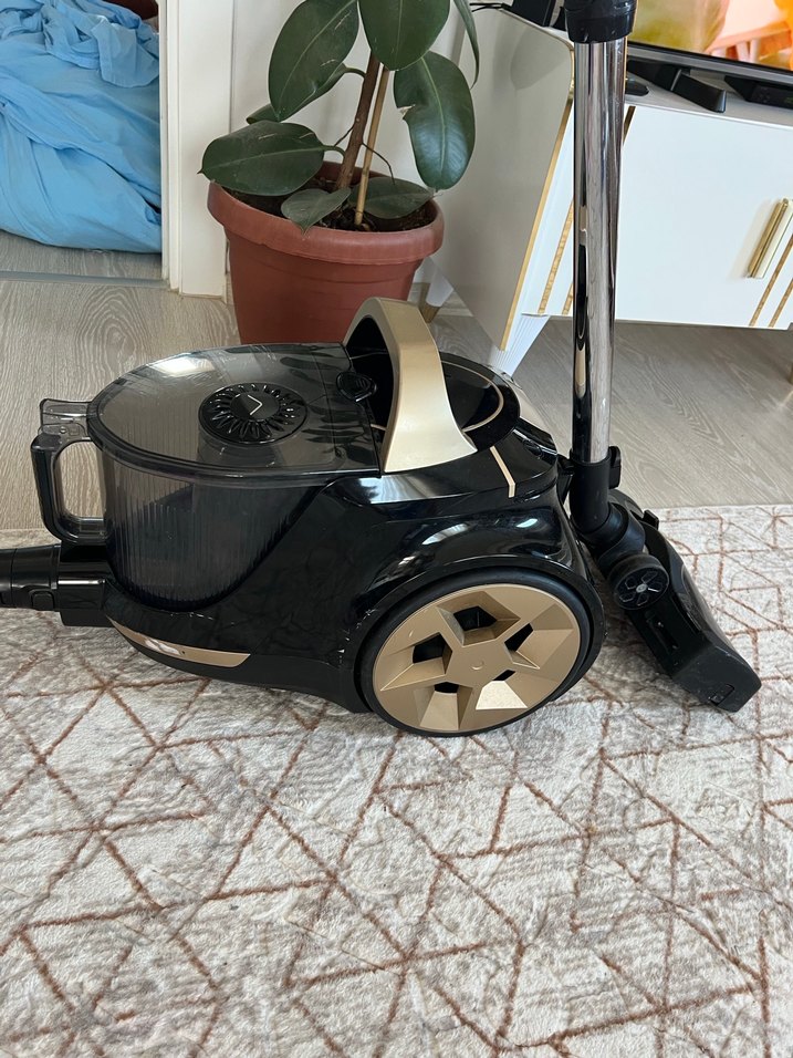 Siyah renkte, toz torbasız, büyük tekerlekli ve tutma saplı elektrikli süpürge. Şeffaf toz haznesi ve çıkarılabilir hortumu bulunmaktadır.