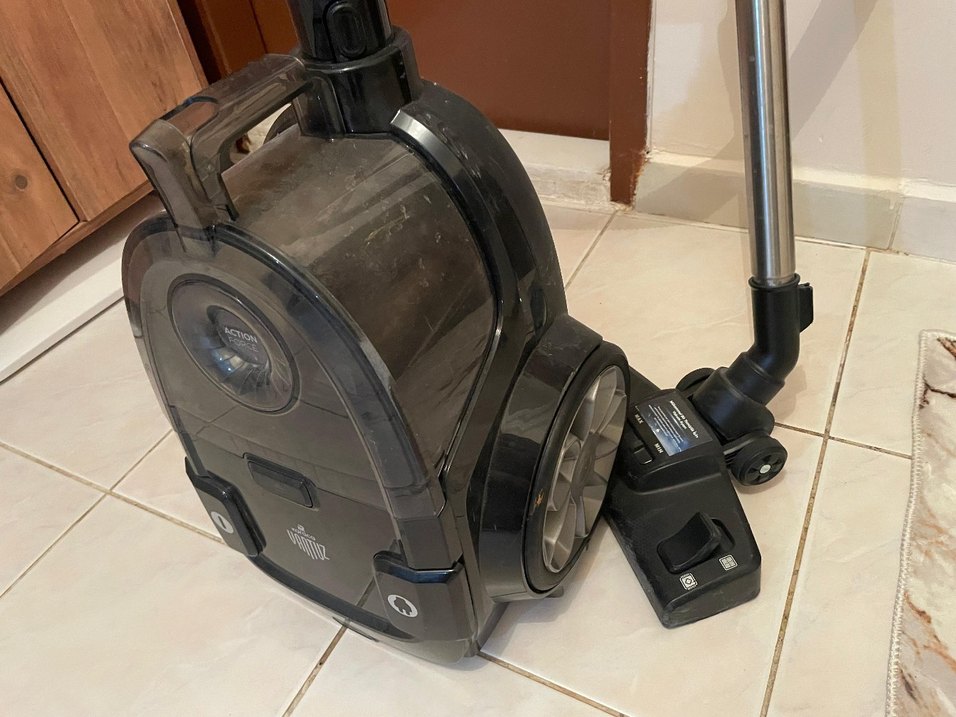 Siyah toz torbasız elektrikli süpürge, kompakt tasarım ve büyük tekerleklerle kolay hareket sağlar. Fayans zeminlerde etkili temizlik sunar.