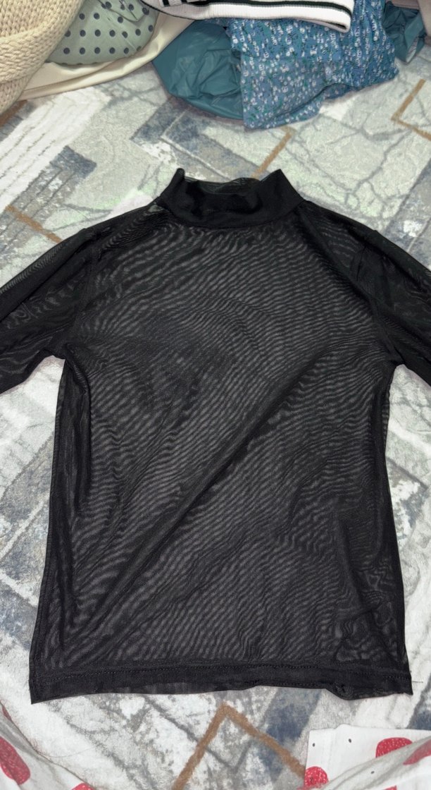 Siyah, boğazlı ve uzun kollu, transparan sentetik kumaştan yapılmış, sokak modasına uygun, grunge punk tarzında, dar kesim kadın bluz.