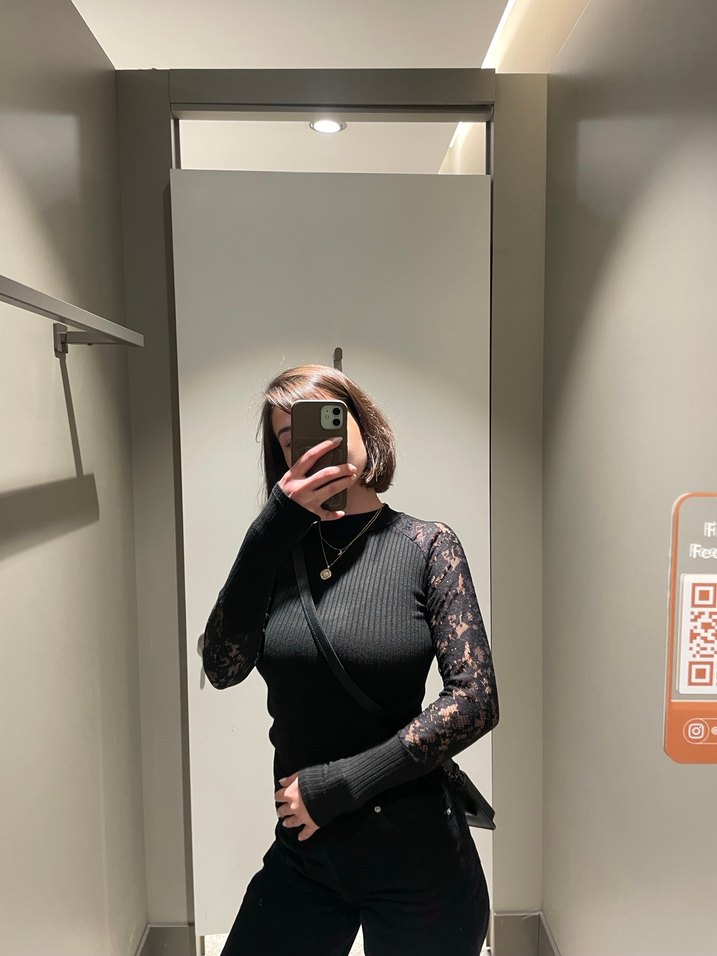 Siyah, yüksek yakalı ve uzun transparan dantel kollu triko kazak