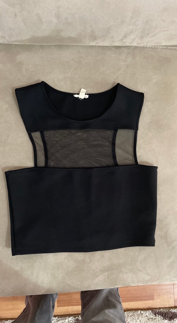 Siyah, kolsuz, transparan detaylı crop top. Sentetik kumaştan hic giyilmedi