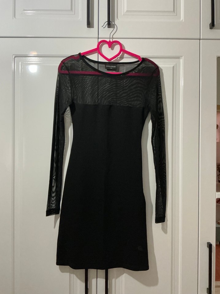 Siyah, uzun kollu ve transparan detaylara sahip, gothic ve avant-garde tarzında, romantik akşamlar için uygun midi boy elbise.