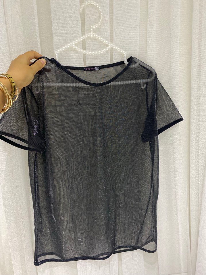 Siyah parlak, kısa kollu, yuvarlak yakalı ve bol kesim bluz. Sentetik kumaştan, transparan yapıda, gotik stile uygun. Günlük kullanıma uygun, trend bir parça.