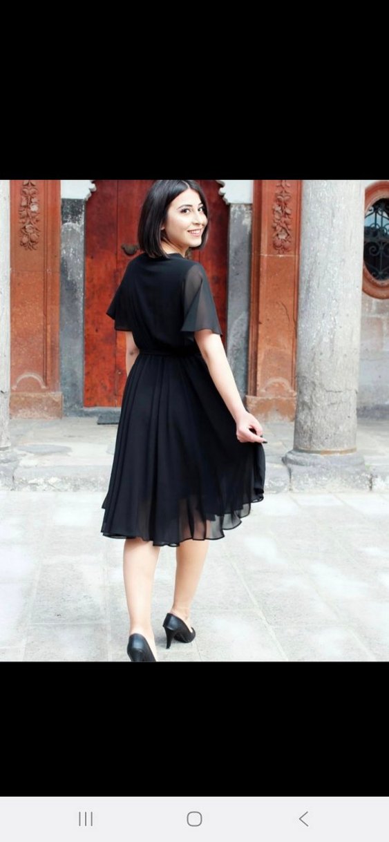 Siyah, uzun, bol kesim, V yakalı ve kısa transparan kollu elbise. İpeksi kumaştan, günlük şık gotik tarzına uygun uygulamadan aldım 3 saat kullandım.