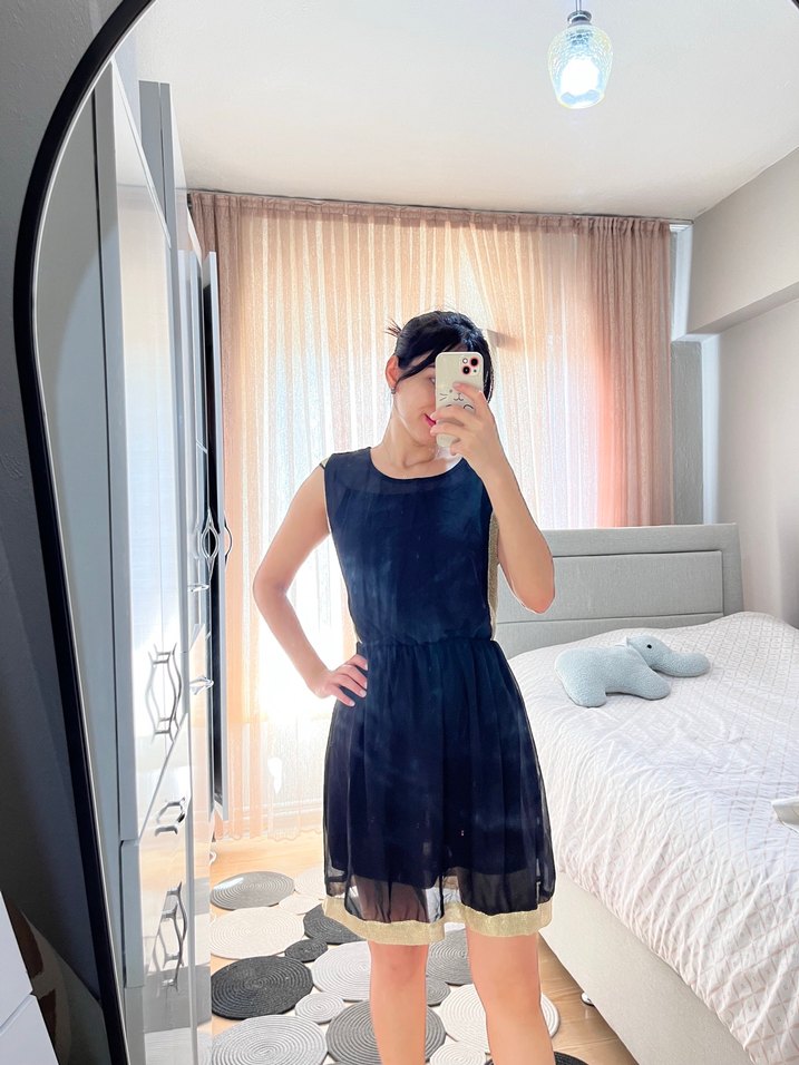 Siyah, transparan, ince dokulu midi elbise, kolsuz ve askısız, şık ve günlük kullanıma uygun. ✨