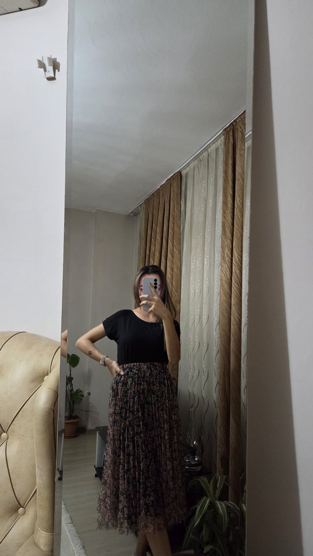 çiçek desenli, şifon tül detaylara sahip, sentetik kumaştan midi uzunlukta bol kesim etek. Günlük kullanım için uygun, bohem ve retro tarzda.