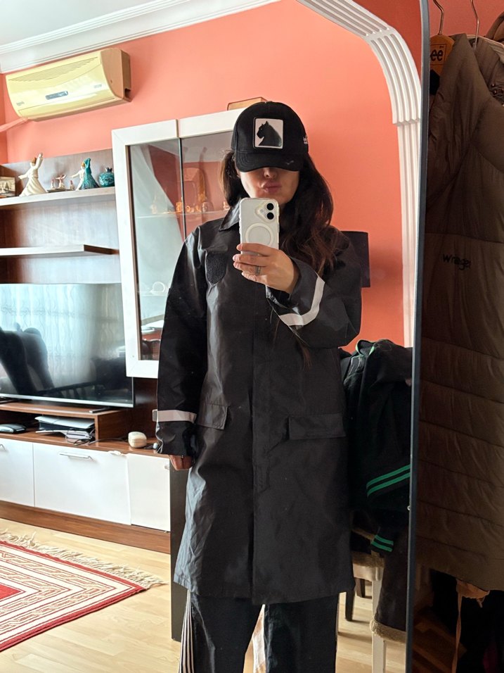 Siyah transparan plastikten yapılmış, diz boyu midi yağmurluk. Uzun kollu, kesik yaka ve regular fit ile günlük kullanıma uygun.
