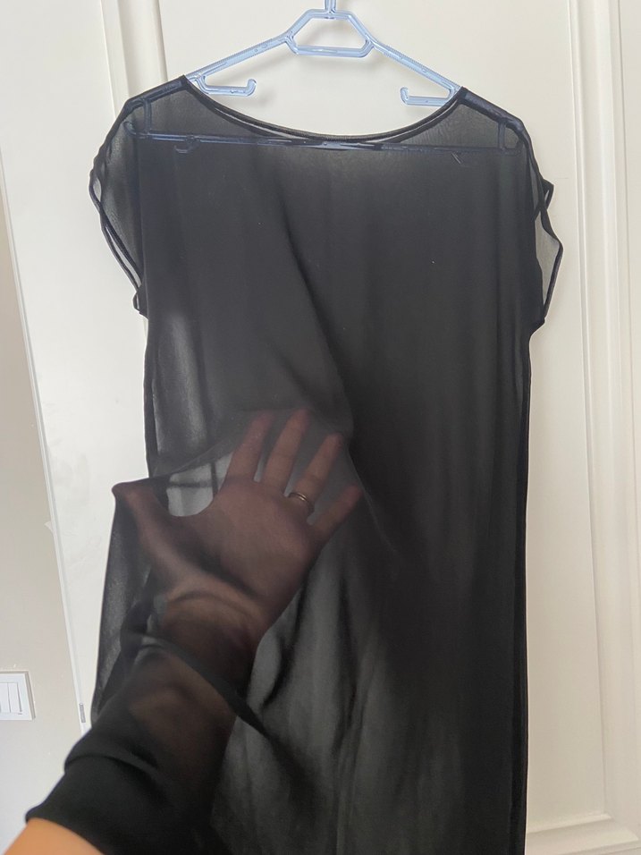 Siyah transparan hamile tuniği, drapeli ve vücuda oturan kesime sahiptir. Kolsuz, bisiklet yaka ve günlük kullanım için uygundur.
