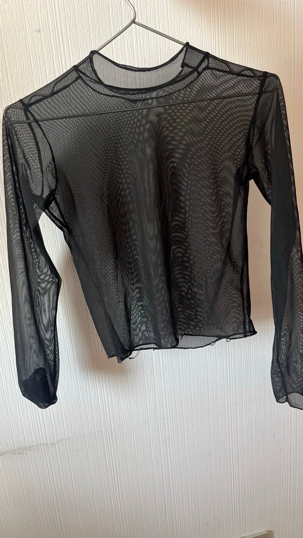 Uzun kollu, boğazlı ve siyah transparan sentetik kumaştan yapılmış dar kesim bluz. Koyu renkte, desensiz ve gotik stile uygun.