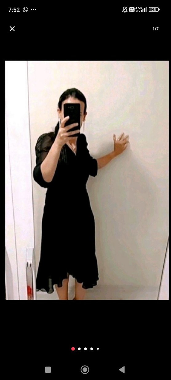 Siyah, transparan uzun kollu ve V yakalı, ipeksi kumaştan yapılmış, abiye, vücuda oturan midi elbise.
