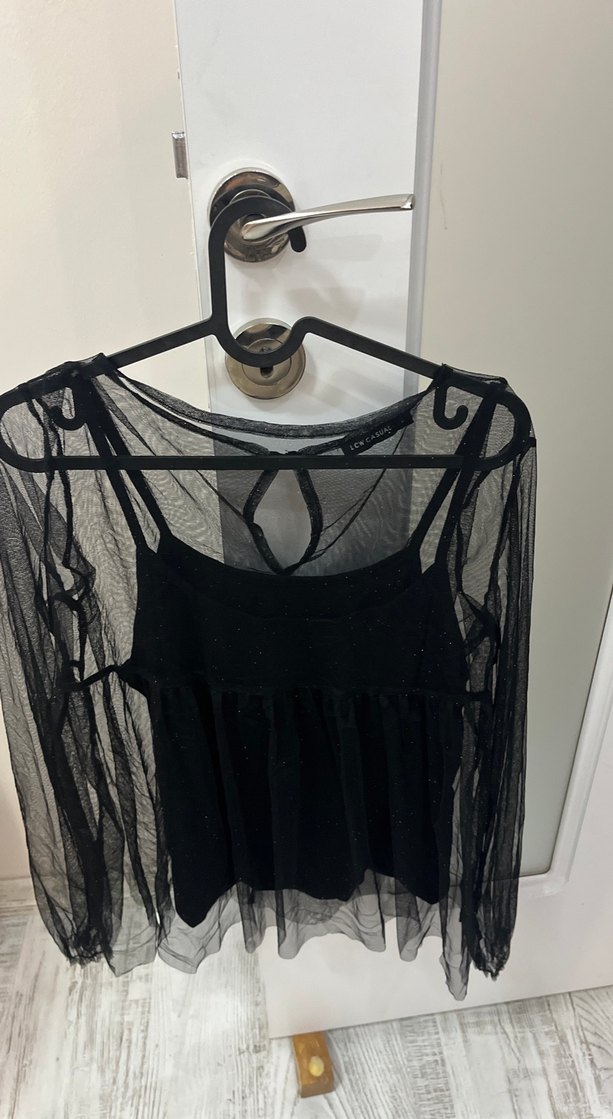 Siyah transparan, uzun kollu, straplez yaka ve strappy detaylı, bol ve drapeli kesime sahip bluz. Hafif sentetik kumaştan, günlük kullanım için uygundur.