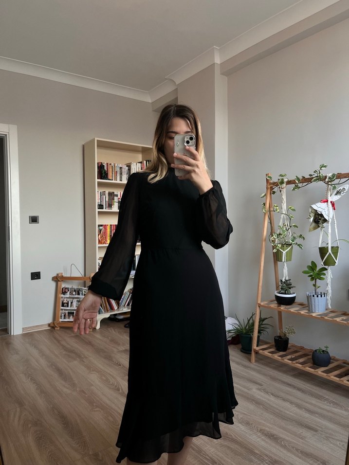 Siyah, transparan uzun kollu ve yüksek yakalı bu uzun elbise, rahat kesimiyle trend ve gündelik stil sunar. Ofis için uygun gotik tarzda.