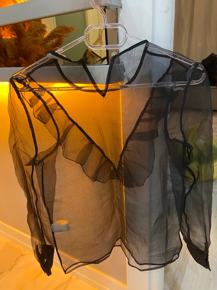 Siyah transparan, V yaka ve askılı kollara sahip, hafif keten kumaştan yapılmış, bol kesim ve midi boyda bluz. Avant-garde goth tarzıyla partiler için uygun.