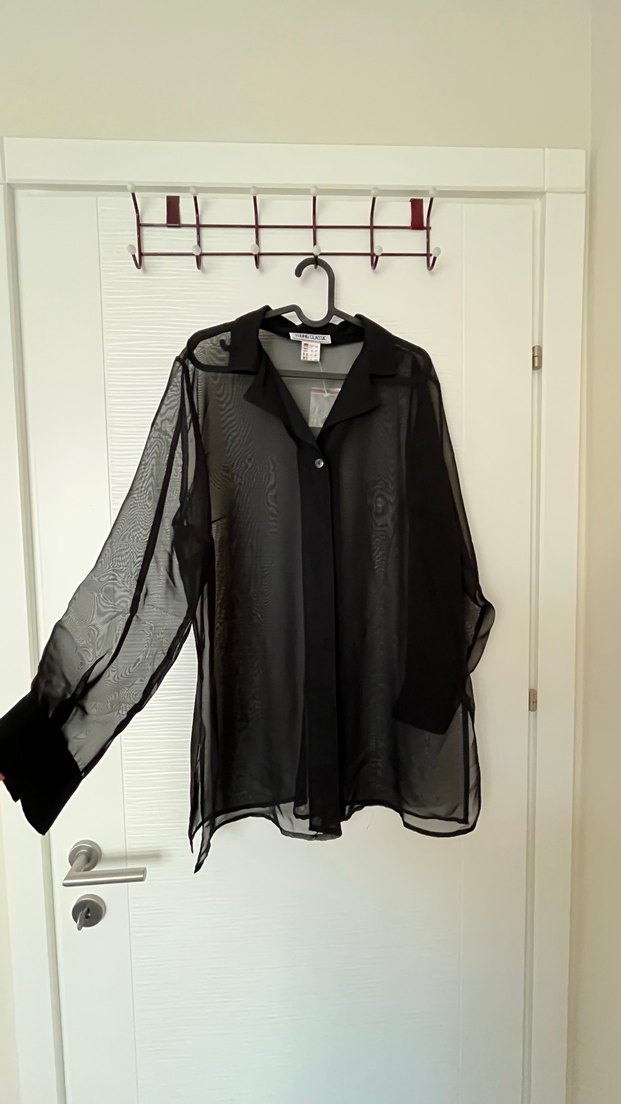 Siyah transparan, uzun kollu, bol kesim V yakalı kadın gömlek. İpeksi kumaştan yapılmış, ofis için uygun gotik tarzda.