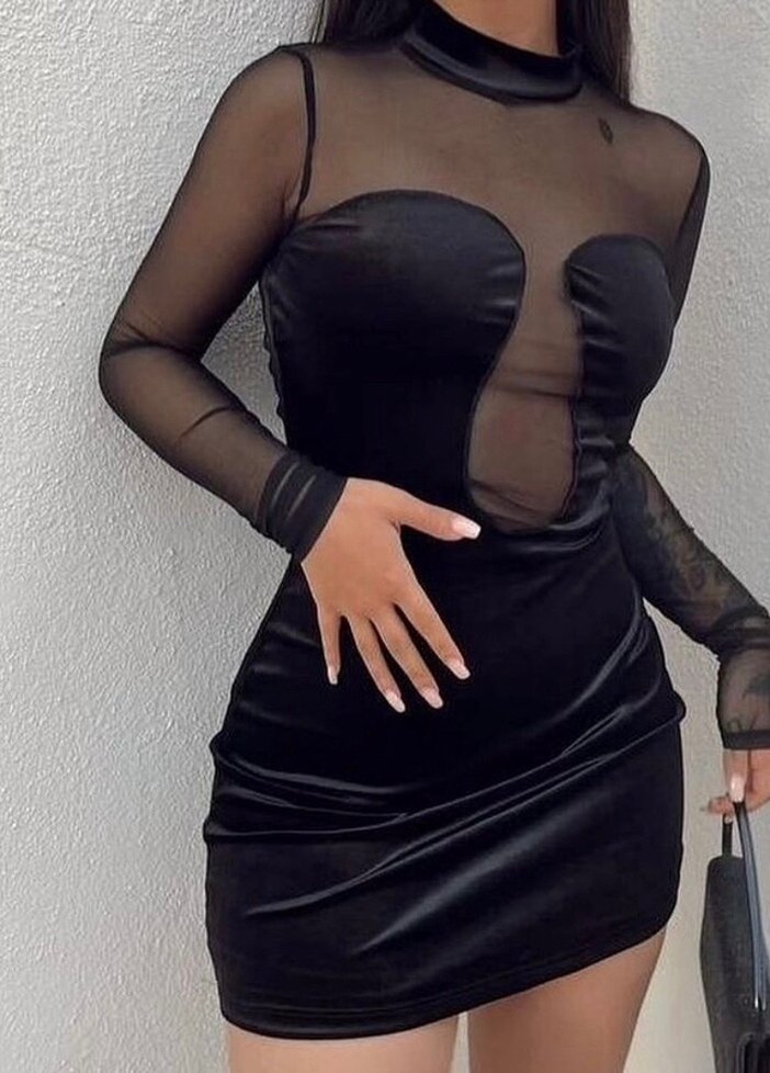 Siyah, straplez saten görünümlü mini elbise, transparan uzun kollu ve üst kısım detaylıdır