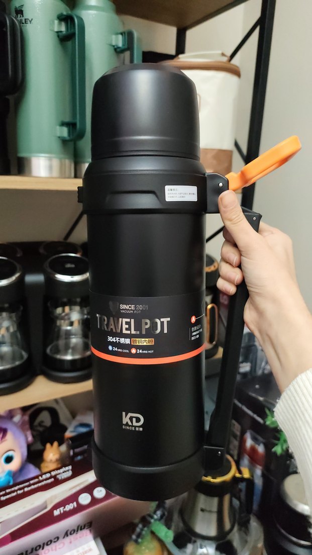 Siyah çocuk termos şişesi, içecekleri 24 saat sıcak tutar. Taşıma kolaylığı için sağlam sap ve güvenli kapak bulunur. Etiketinde "TRAVEL.POT" ve "SINCE 2001" yazıyor.