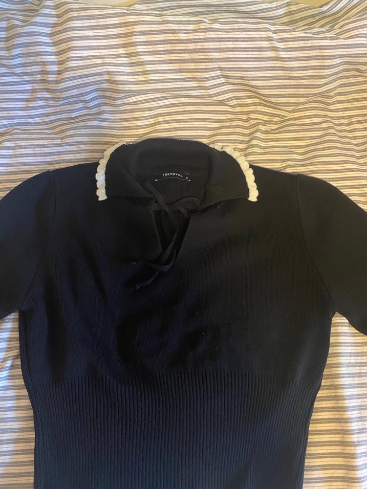 trendyol milla marka, boy 42 omuz 37. fiziği güzel gösteren bir triko. göründüğü gibir defosu yok